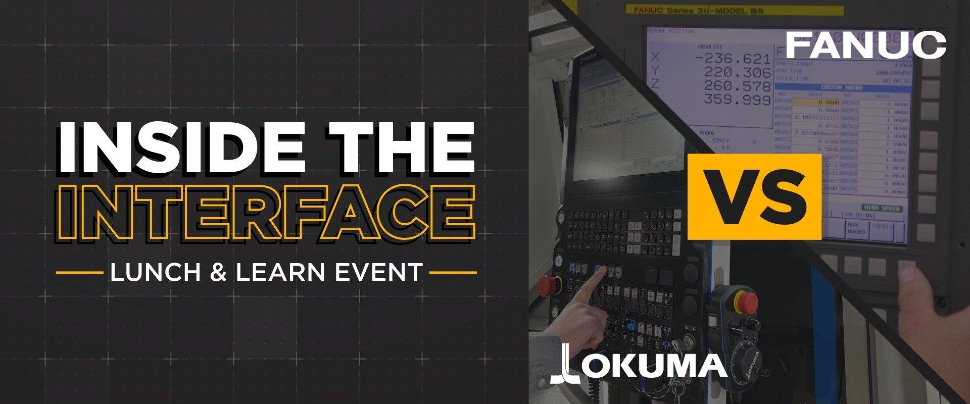 Join us for lunch as we dive Inside the Interface, focused comparison between the Okuma OSP control and Fanuc control systems. Whether you’re a seasoned machinist, an engineer, or curious about control capabilities, this event will offer valuable insights into how each system performs and integrates.